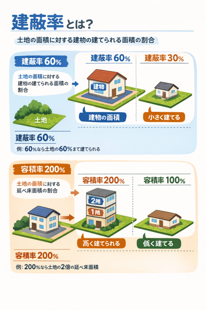 🧱 建蔽率(けんぺいりつ)= 土地に置ける“レゴの広さ”のルール 土地の上に、どれくらい“ひろく”家を置いていいかを決めるルール。 レゴでたとえると… 土地=レゴの土台 家=レゴの建物 建蔽率60% → 土台の60%まで建物を置いてOKつまり、土台の半分以上を... -